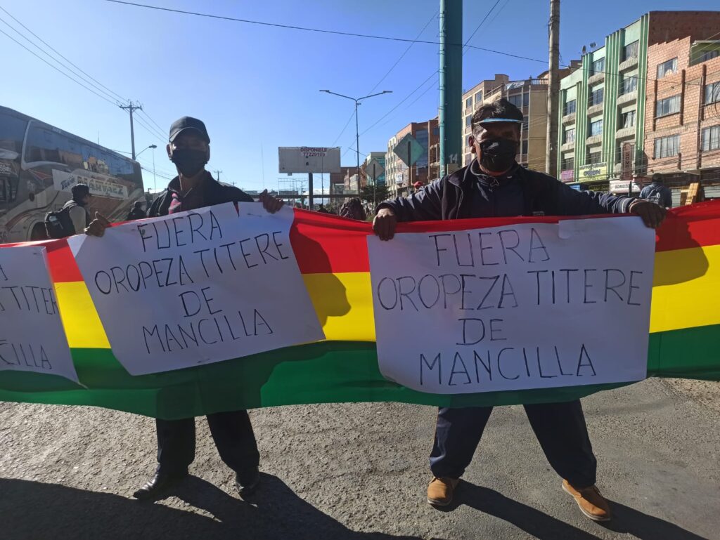 “Hay varias federaciones y cada federación consta hasta de 300 asociaciones. Todas las asociaciones tienen trámites en curso en la dirección ferias y mercados del señor Oropeza, ese señor Oropeza ha sido posesionado con el (visto bueno del) señor Mancilla, cualquier trámite que se realiza, lo que firma con la mano luego lo borra con el codo, por la presión de Mancilla. Si no estamos de rodillas ante Mancilla, no nos dan curso (al trámite) y para pagar la patente de una asociación tenemos que pagar seis mil (o) siete mil bolivianos, eso tenemos que pagar de coima, nos están extorsionando”, denunció el dirigente Oscar Elias.