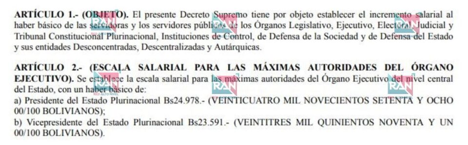 “Se establece la escala salarial para las máximas autoridades del Órgano Ejecutivo del nivel central del Estado, con un haber básico de: a) Presidente del Estado Plurinacional Bs 24.978; b) Vicepresidente del Estado Plurinacional Bs 23.591”, señala el artículo 2 de la norma publicada el 1 de mayo.